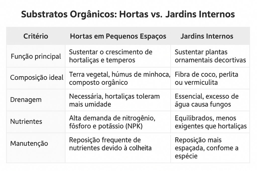 Para facilitar a escolha do substrato ideal em apartamentos, é importante visualizar claramente as diferenças entre hortas e jardins internos ornamentais. Embora ambos utilizem vasos e ambientes controlados, as necessidades das plantas variam bastante.